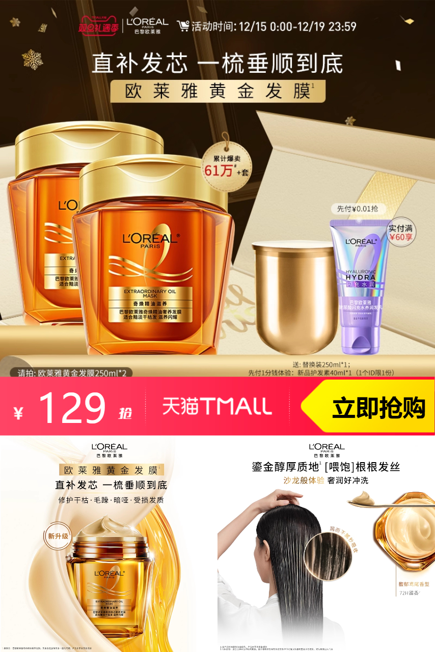 【【1】官方立减19,限时补贴4.66,淘金币4.74,首单礼金7元,凑品类券500-40,消费券200-25,到手约87;【2】买就送替换装*1,先买1分钱礼,在送护发素40ml】欧莱雅黄金发膜,含麦卢卡蜂蜜,富含氨基酸及维生素,专为干枯受损发质定制,让秀发柔顺不卡梳,顺滑不炸毛,闪耀不干枯~