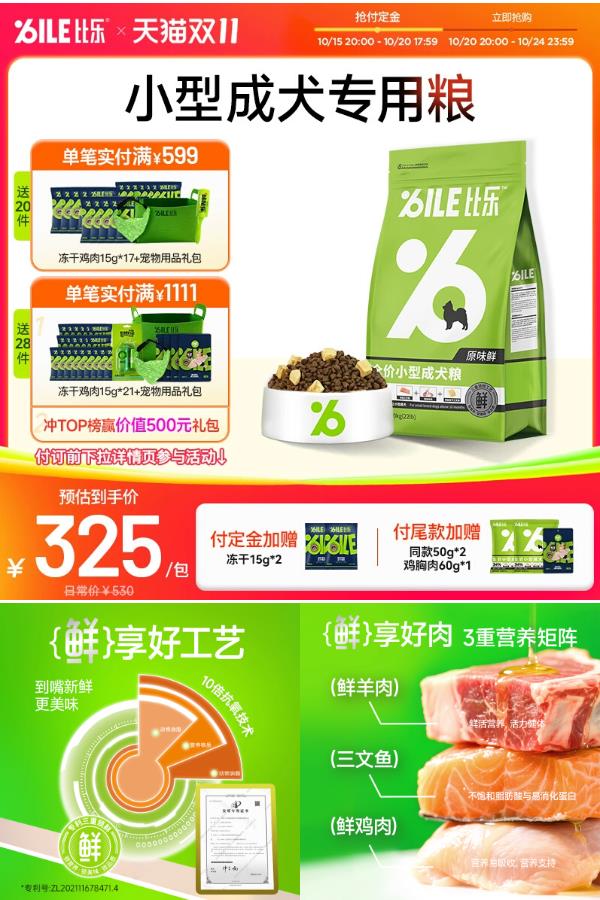 【定金50,可叠加消费券+淘金币频道补贴到手价低于287元/20斤】比乐全价犬粮3重肉源羊肉+鸡肉+三文鱼,肉蔬巧搭配,多样化饮食