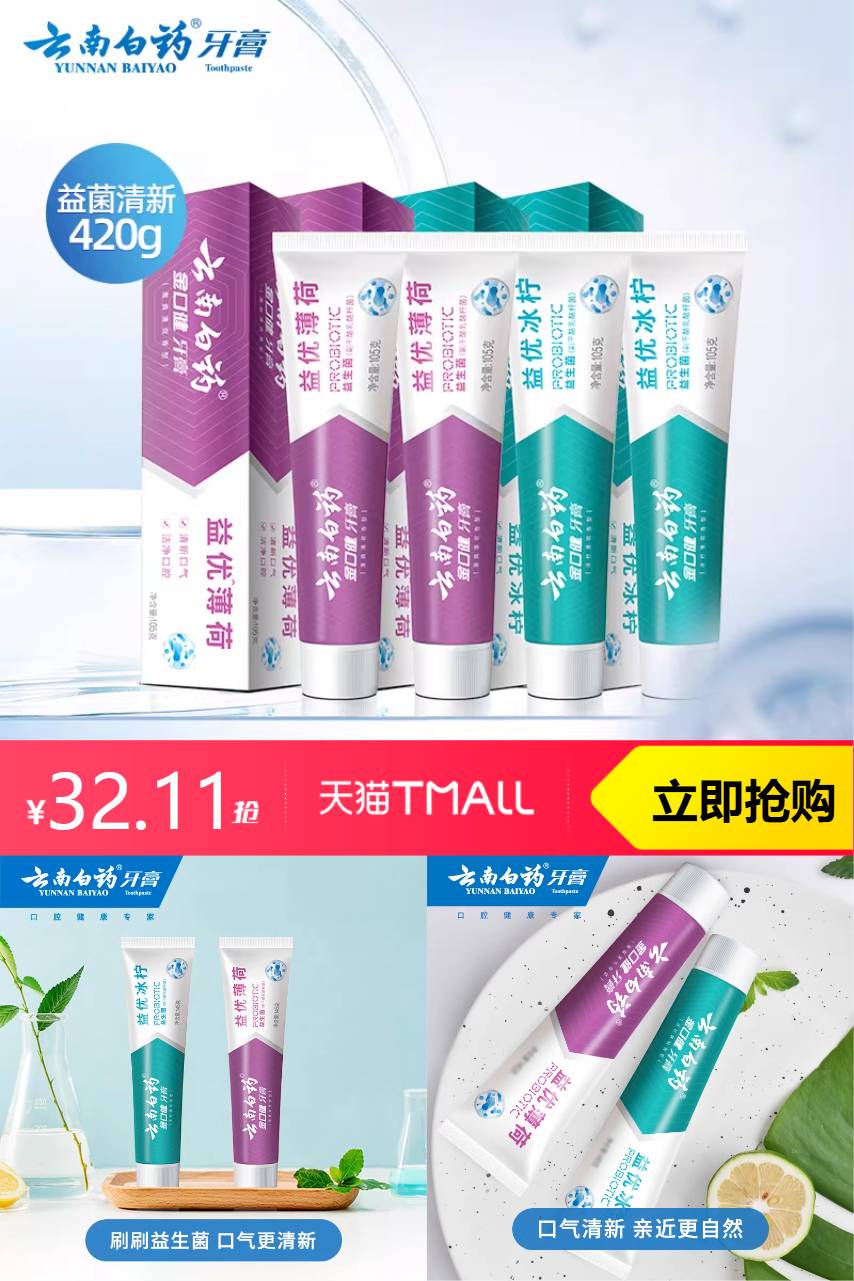 【叠加2.59淘金币到手32.11,凑消费劵到手28.2 】云南白药牙膏益生菌4支420g,14年品牌老店清口气,去牙渍,缓解口腔问题,持久清新,加倍呵护,健康口腔,全家人的口腔专家,更多修护,保留幸福。