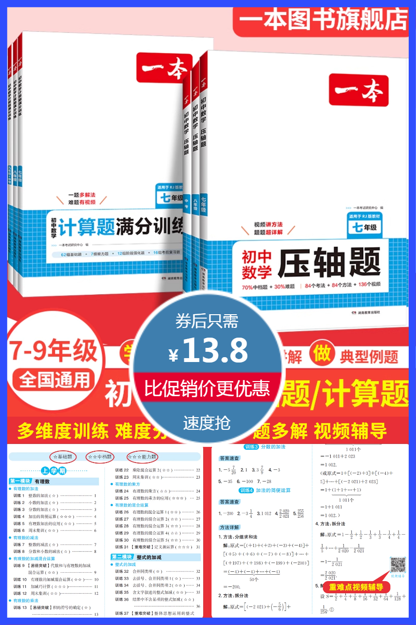 一本初中数学计算题满分训练,7-9年级通用,学解题方法,看视频讲解,做典型例题,多维度训练,难度分级,一题多解,视频辅导!