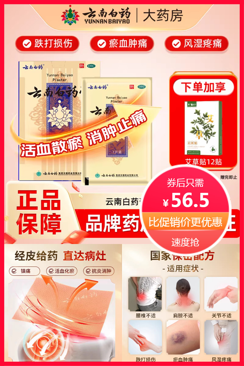 【淘金币抵扣8.1元+官方立减13.5元+消费券满200减25元到手约37元1盒15片+满79元加享艾草贴12贴】云南白药,品牌自营,正品保证,活血化瘀,舒缓疼痛,百年品牌值得信赖!扭伤拉伤,淤青肿胀,风湿疼痛,用云南白药膏药贴,止痛更袪痛,消肿止痛除风除湿,这个是真的好用,哪里痛贴哪里