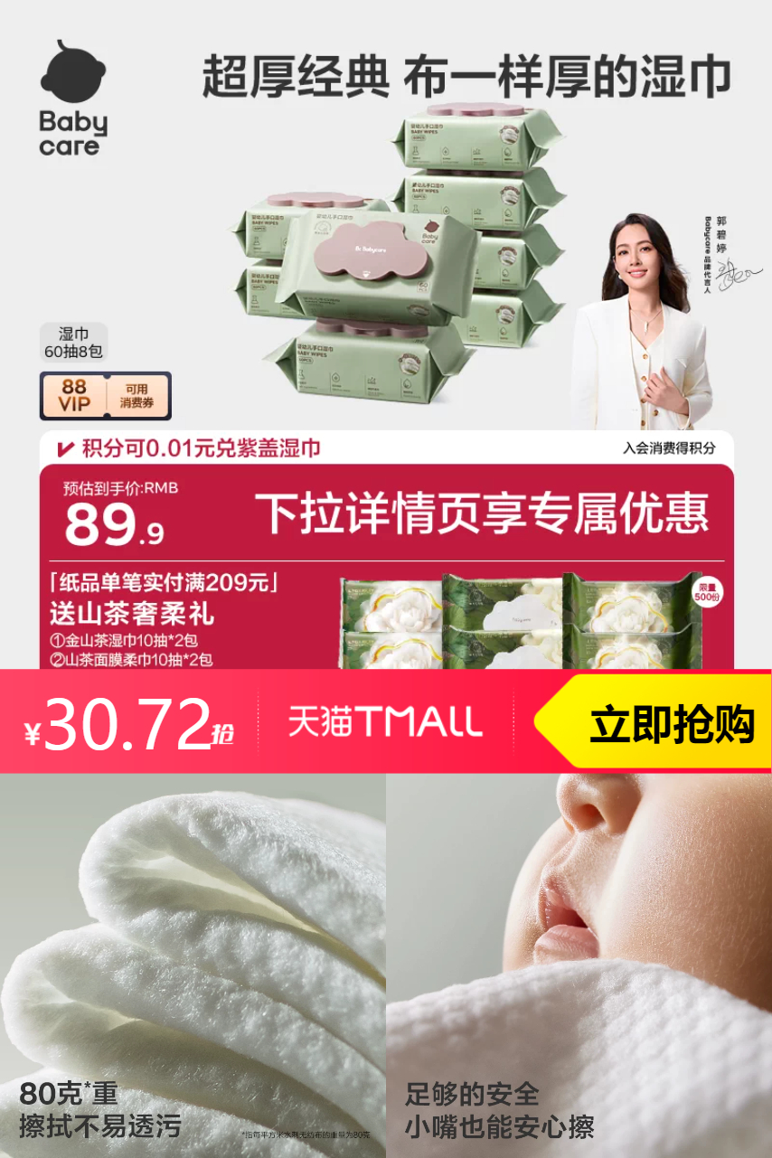 【百补叠加淘金币3.18到手30.72】babycare手口湿纸巾,孕妇宝宝都可以用,厚实加大,双重锁定7次净化纯水,水润保湿,宝妈们超值速抢!!!