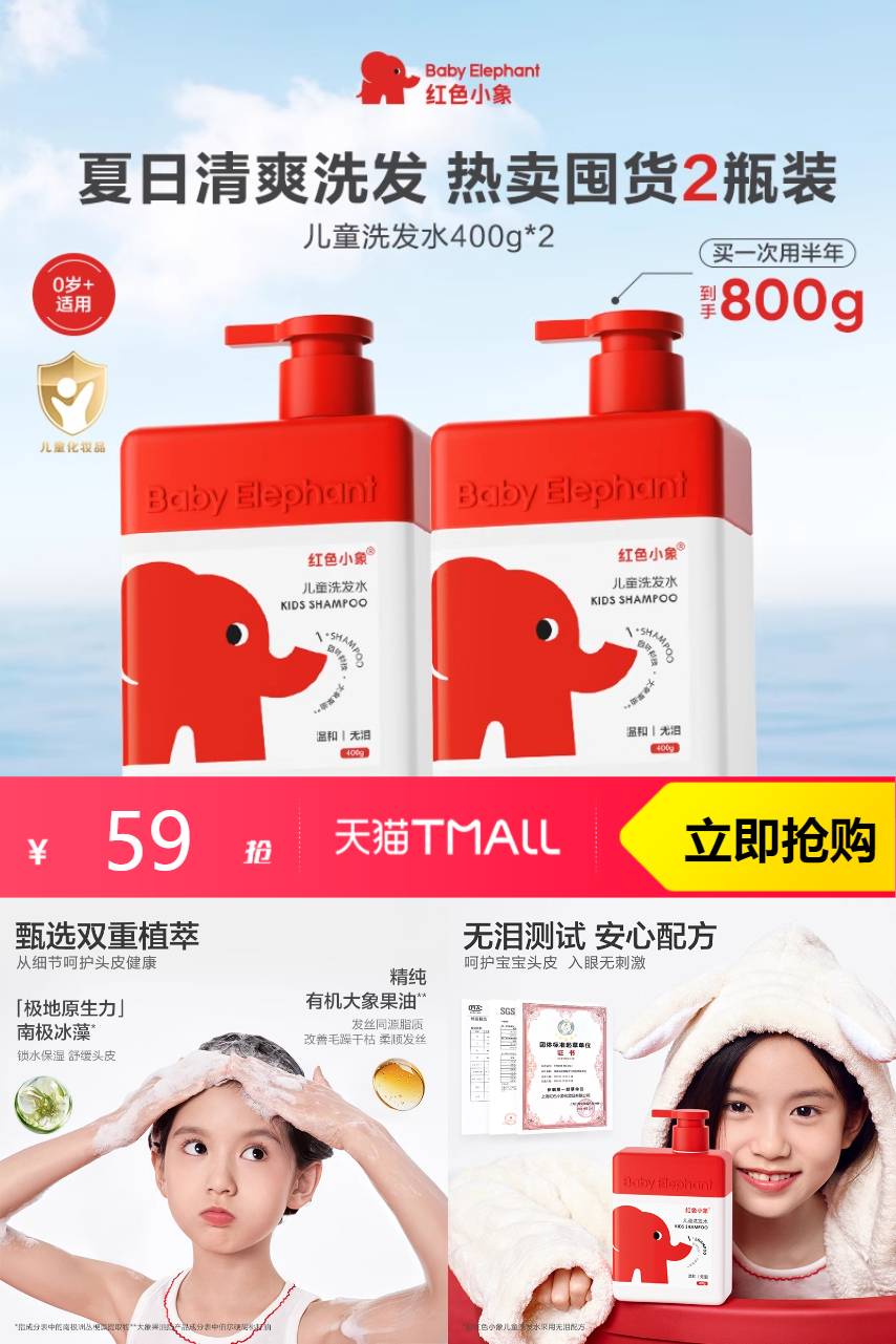 大牌红色小象儿童专研0硅油洗发水!400g*2大瓶!!够用半年!两性复配氨基酸表活!精纯有机大象果油!发丝同源脂质改善毛躁干枯!柔顺发丝高效清洁!温和保湿留润!舒润头皮!泡沫绵密!0岁+通通适用!