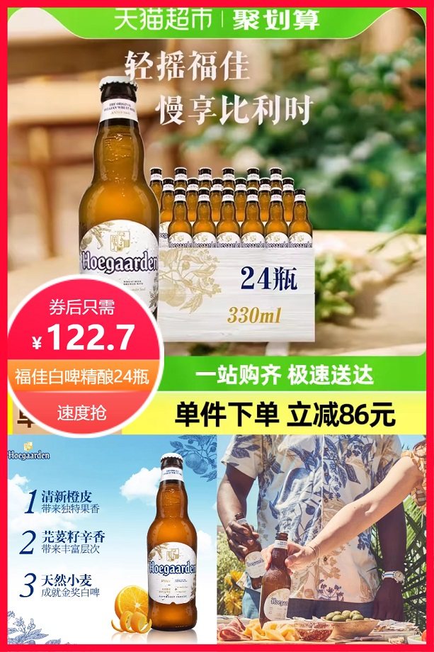 【淘礼金14.3元+券15元+超级立减84元+淘金币抵扣6元后约122.7元,凑单200-25后约105元】Hoegaarden/福佳白啤酒,比利时风味小麦精酿330ml装,醇厚绵密,馥郁果香。