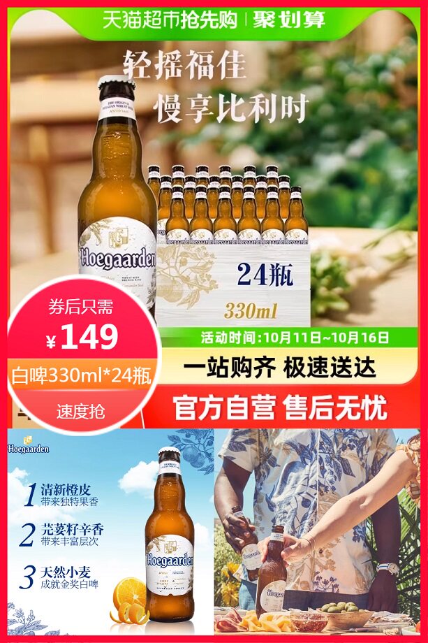 【券5元+超级立减84元+淘金币抵扣4元后约149元】Hoegaarden/福佳白啤酒,比利时风味小麦精酿330ml装,醇厚绵密,馥郁果香。