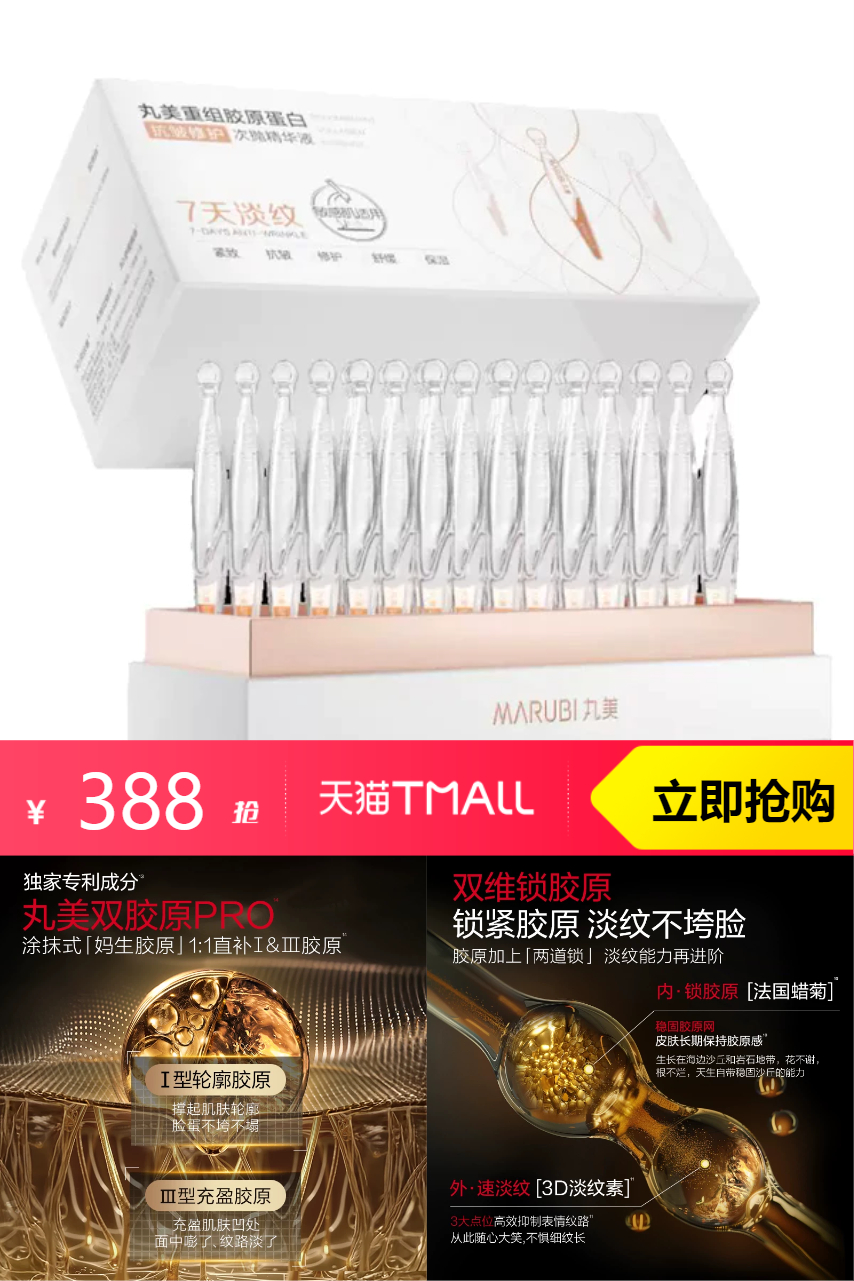 【比例30%,赠送25只次抛+面膜5片+礼盒,消费券立减25+凑单店铺800-120大额券+淘金币19.96到手290左右】丸美胶原小金针次抛精华液,熬夜党福音,垮脸细纹通通闪开!硬核重组双胶原,I型胶原紧轮廓+III型胶原嘭饱满,轻松就把妈生胶原直接补进皮肤最.底层,直充胶原!紧致嘭弹好皮肤稳稳拿下~