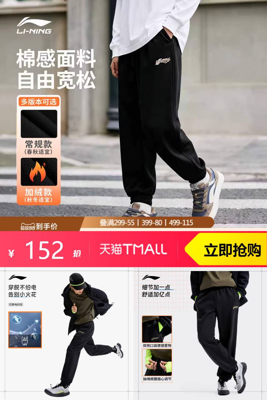 【凑李宁大额券1000-170,店铺券到手仅需98】李宁卫裤,灰色时尚,秋冬休闲!舒适贴身,保暖又显瘦,男士必备。