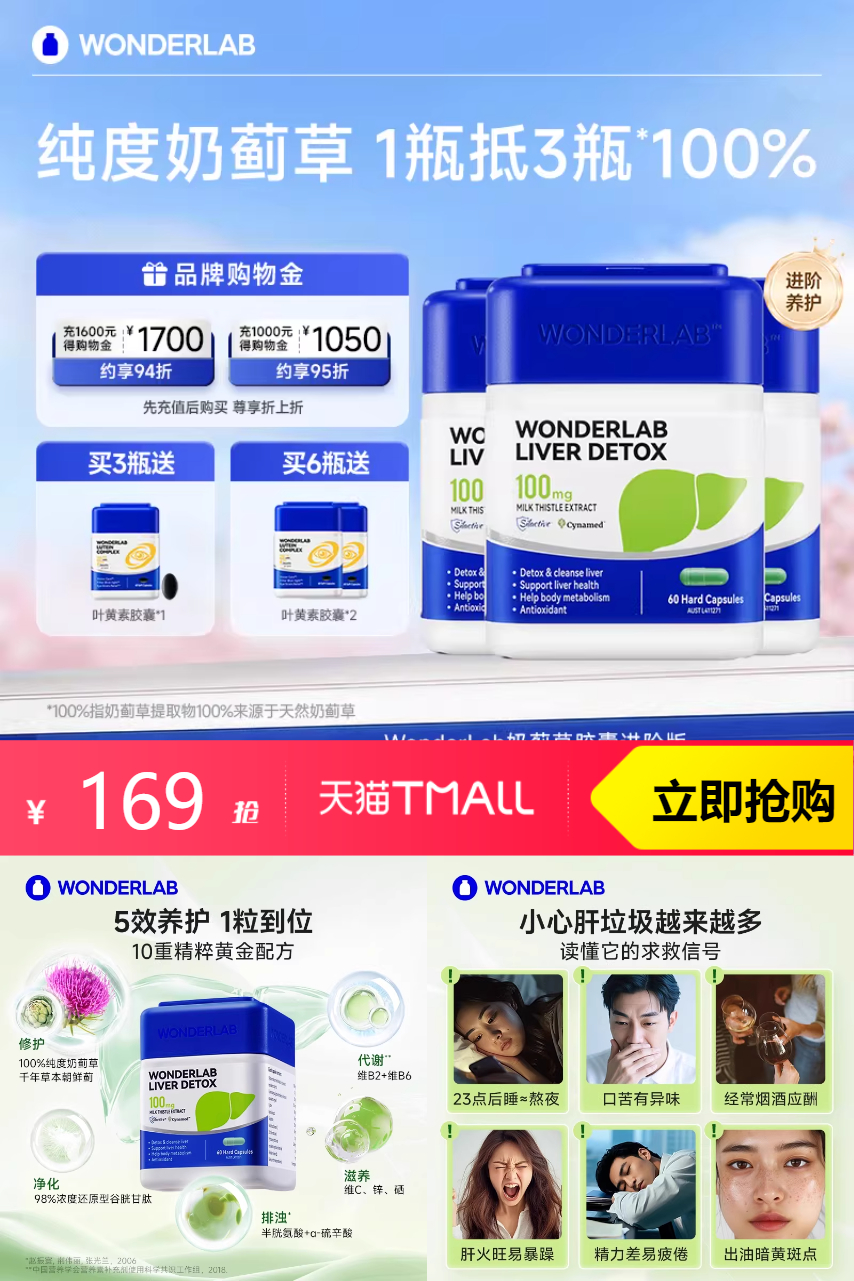 WonderLab奶蓟草护净养肝熬夜加班 259元减80 商品纠错