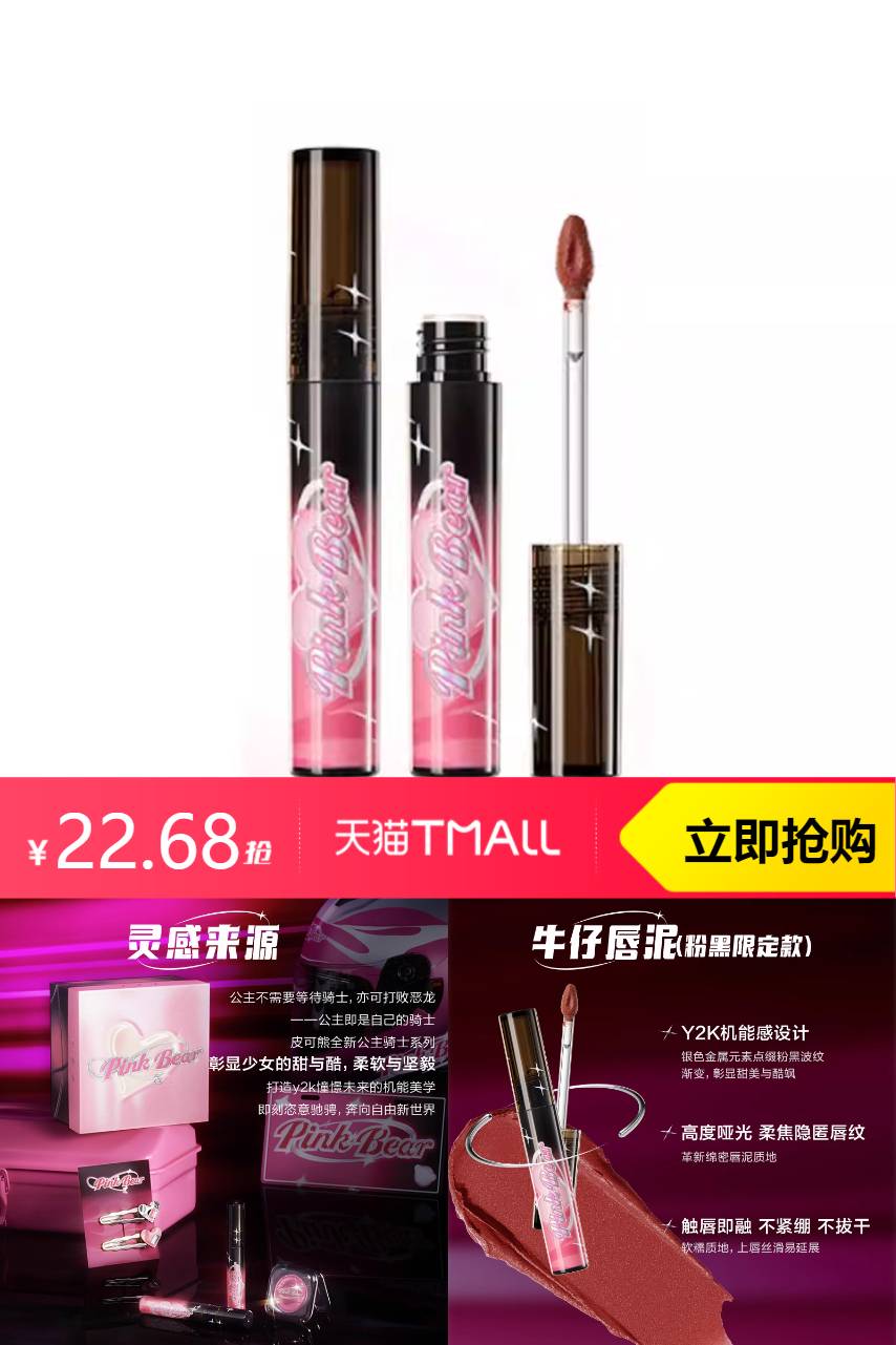 【拍2件到手26元,叠加淘金币到手25.2,再凑消费劵到手22.68,均价一只11.34】pinkbear皮可熊牛仔唇泥粉黑限定款唇釉哑光唇泥唇彩送女友,哑光质地不拔干,水润显色。