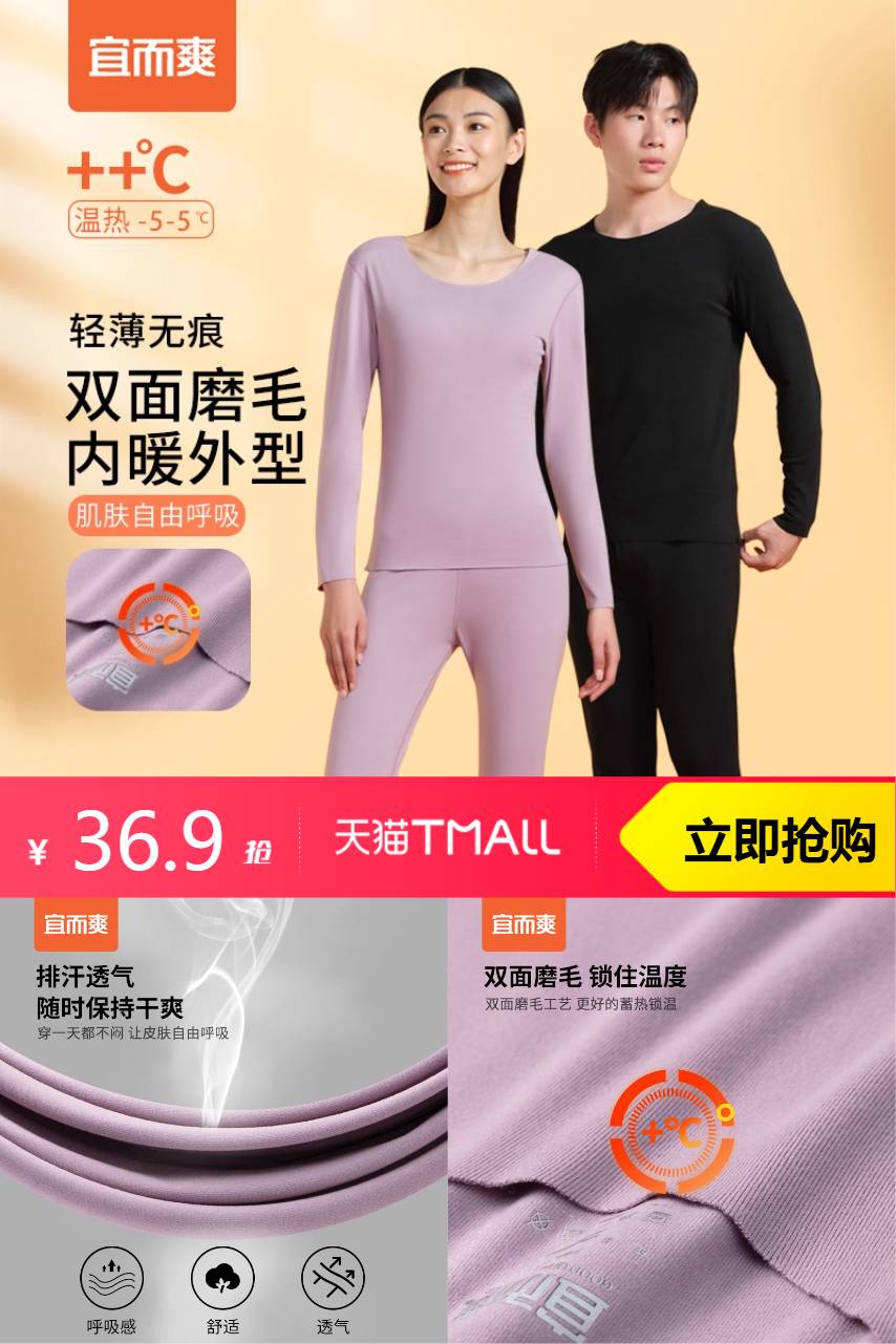 【右上角点淘金币加购,叠加淘金币+消费券到32.3一套!】宜而爽保暖内衣套装男士春秋无痕打底修身双面磨毛女款秋衣秋裤T,,恒温保暖,轻盈过冬,吸湿透气,柔软亲肤,男女款都有,轻松过冬天!