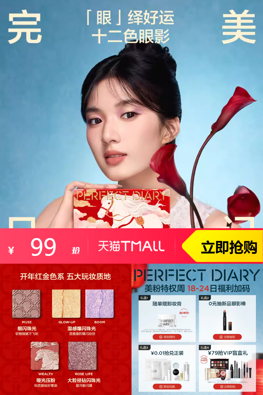 【直播专属礼利是封(3个装)+卸妆湿巾*3,原价129-官方立减30,券后价=99元,叠加官方限时补贴6.27+6.49元限时折扣券+9.46元淘金币+0.38元红包,到手76.4元】完美日记探险家十二色动物眼影盘小猪盘,每个色块都精心设计,无论是日常妆容还是派对妆容,都能找到适合你的那一款。细腻的珠光、微妙的哑光,层次感十足,轻松打造出深邃的眼神。