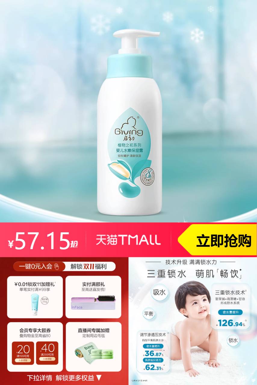 【赠水嫩高保湿露60mlx2;限时补贴2.31,88vip9.5折抵扣3.44元,淘金币抵扣5.01元,9折消费券抵扣6.03元,母婴惊喜券300减30抵扣8.37,到手31.99元,】启初婴儿宝宝润肤乳保湿露235ml*2瓶,细心呵护宝宝娇嫩肌肤~