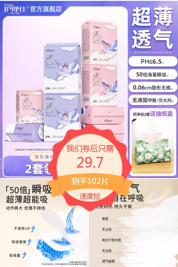 【官方立减7.2元,领23元优惠券,88vip可抵用淘金币,到手约20元102片】50倍海量吸收,动作再大,优雅不掉线,超薄隐形无痕,穿衣自由,贴身不显形,无添加甲醛/荧光剂,舒适安全!