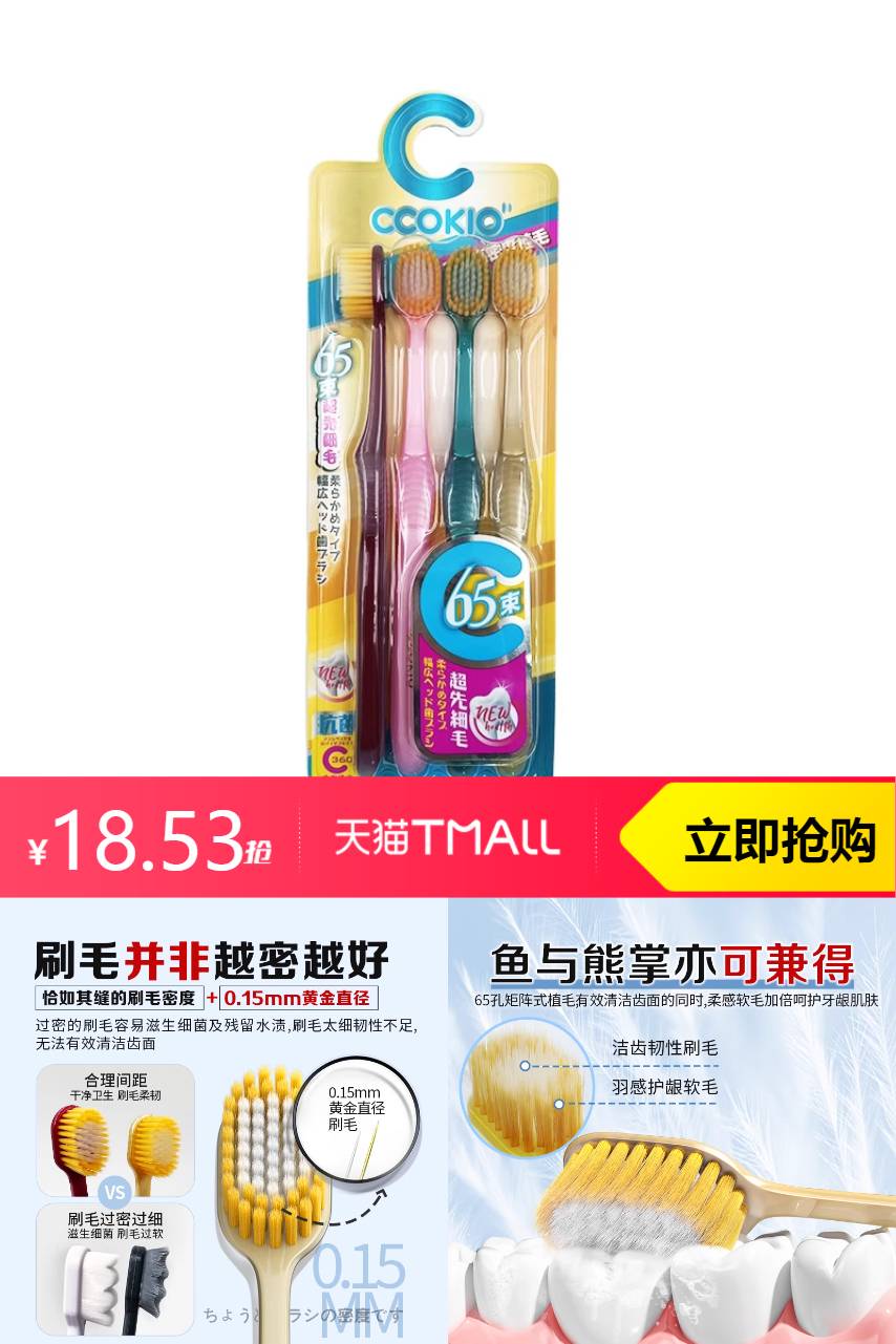 【原价25.83-官方立减3.9-3.4立减优惠-淘金币1.67-消费券1.67=15.06】日本CCOKIO宽头65束软毛牙刷,65孔矩阵式植毛,有效清洁齿面的同时,柔感软毛加倍呵护牙龈肌肤,薄一点,舒适不止一点点,缝缝角角都刷干净~