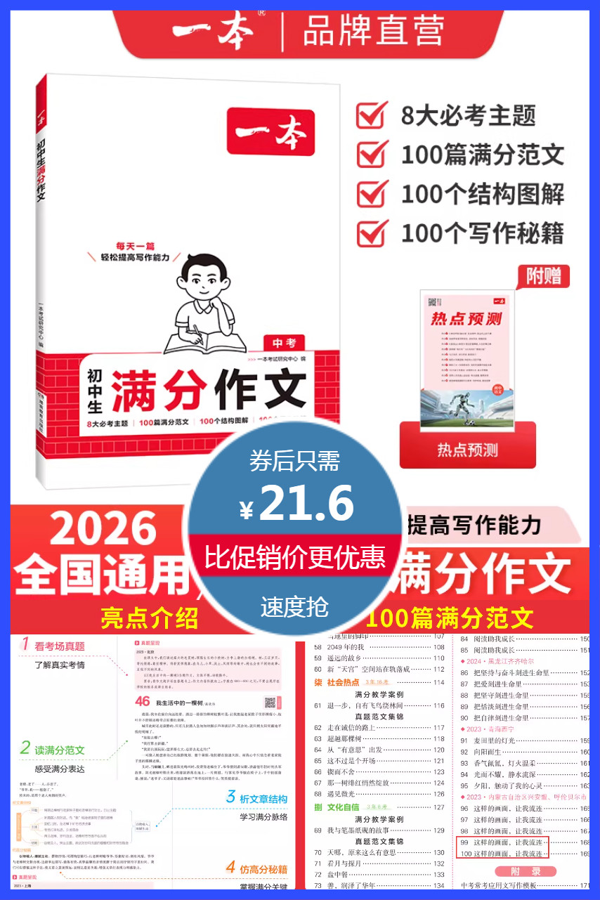 送热点预测!一本初中中考通用满分作文,8大必考主题,100篇满分范文,100个结构图解,100个写作秘籍,每天一篇,轻松提高写作能力