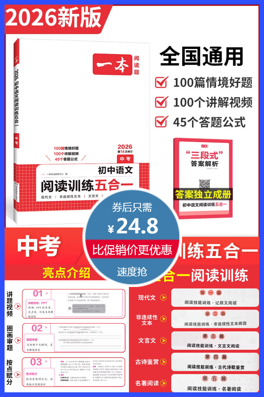 "送三段式答案解析!一本初中语文阅读训练五合一,通用,100篇情境好题,100个讲解视频,45个答题公式,讲题视频,圈画审题,按点赋分,提高阅读能力! """