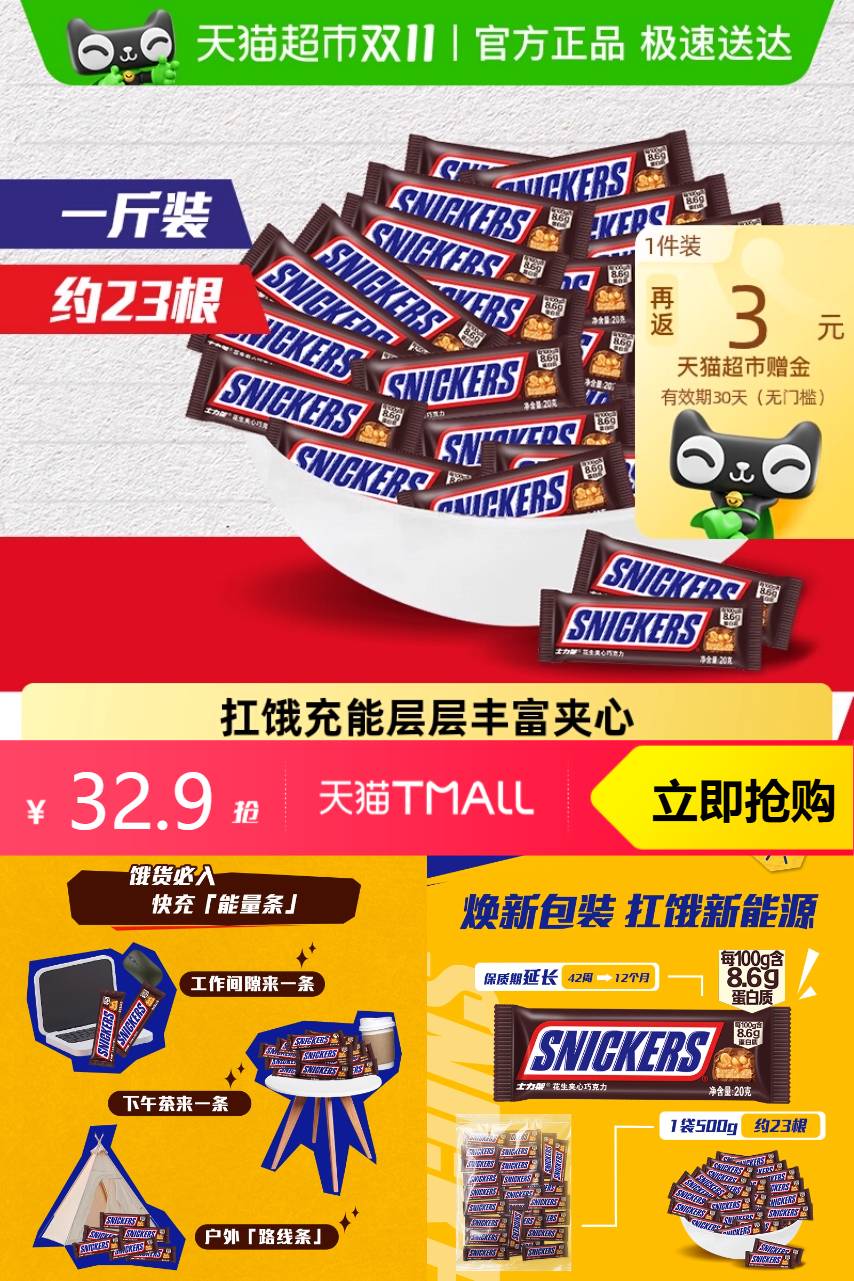 【立减17元,超市补贴1.02元 新客2元 ,猫卡3元,到手26.5元;2、价到礼金活动,补贴淘礼金,到手会更低】士2倍购士力架原味散装共500g,美味无边界。花生夹心,味道更佳。