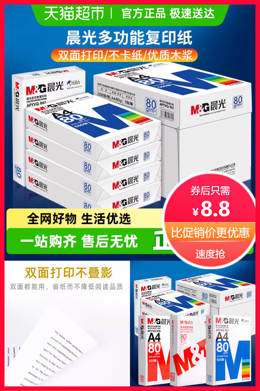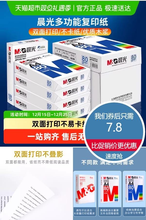 晨光a4多功能复印打印纸,双面打印不叠影,省纸而不降低阅读品质,光滑纸面,不卡纸,降低打印机损耗,优质木浆,无粉尘韧性好!