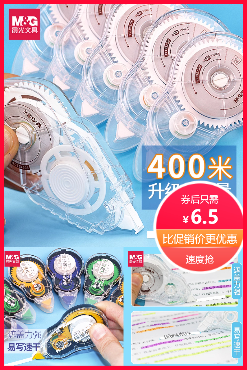 晨光修正带,升级大容量,透明PET膜带,不断带,齿轮顺滑,使用流畅不卡带,环保无异味,5mm宽带轻松覆盖,使用各种常规笔,黏贴牢固!