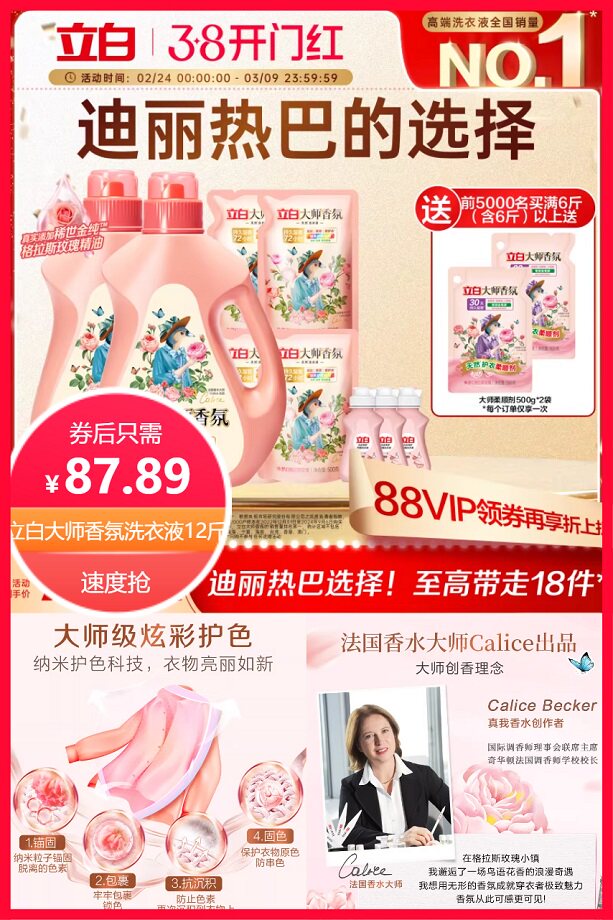 前5千名买满6斤送大师柔顺剂500g*2袋,拍12斤选项到手14斤,直降4.74元+超级立减14元+券5元+88vip省4.51元+店铺限时红包2元+淘金币省2.27元+回购礼金10元后约78.13元,叠加消费券200-25后68.3元,立白大师香氛香水洗衣液,微胶囊悬浮专利,持久留香72小时,纳米护色科技,炫彩护色,衣服亮丽如新,天然酵素,深层洁净!