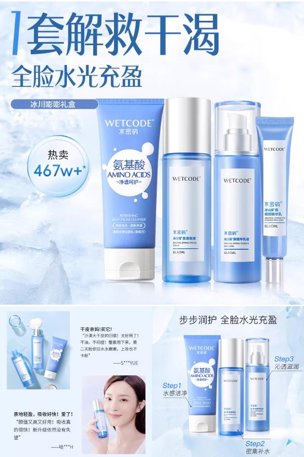 水密码冰川水乳套装,深层补水+锁水双效协同,学生党平价护肤优选,清爽不黏腻,敏感肌也安心~49.9元到手全套!含洗面奶+爽肤水+乳液,三步搞定基础护肤,性价比拉满!水润透亮好状态,现在就能拥有!