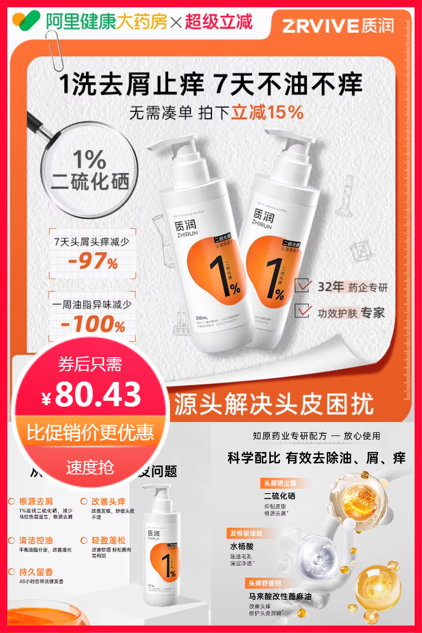 淘金币6.46元+88vip4.02元,到手约69.9元,质润二硫化硒1%洗发水控油,去屑实力派四效合一养护头,清爽无屑,社交距离轻松拿捏自信靓丽无惧镜头