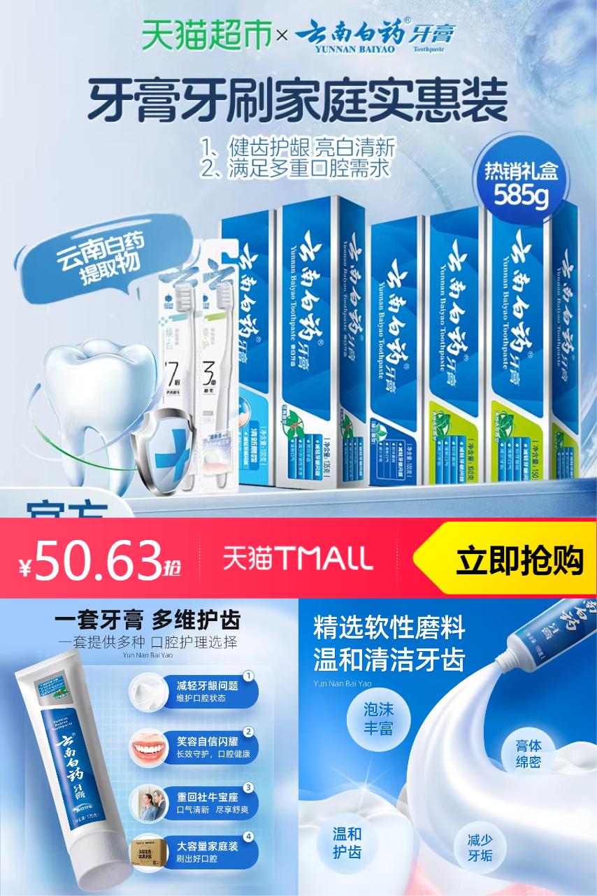 【原价格105-店铺立减22.4-店播劵15元-店播9折劵抵扣6.76(右上角直播停留几秒发放)-3.3礼金-消费劵抵扣6.91=50.63,如果没有消费劵的可以直接下拉详情超级补贴领取6元红包到手51.54,速度冲9折劵优先,先到先得】云南白药牙膏585g套装+2支牙刷,