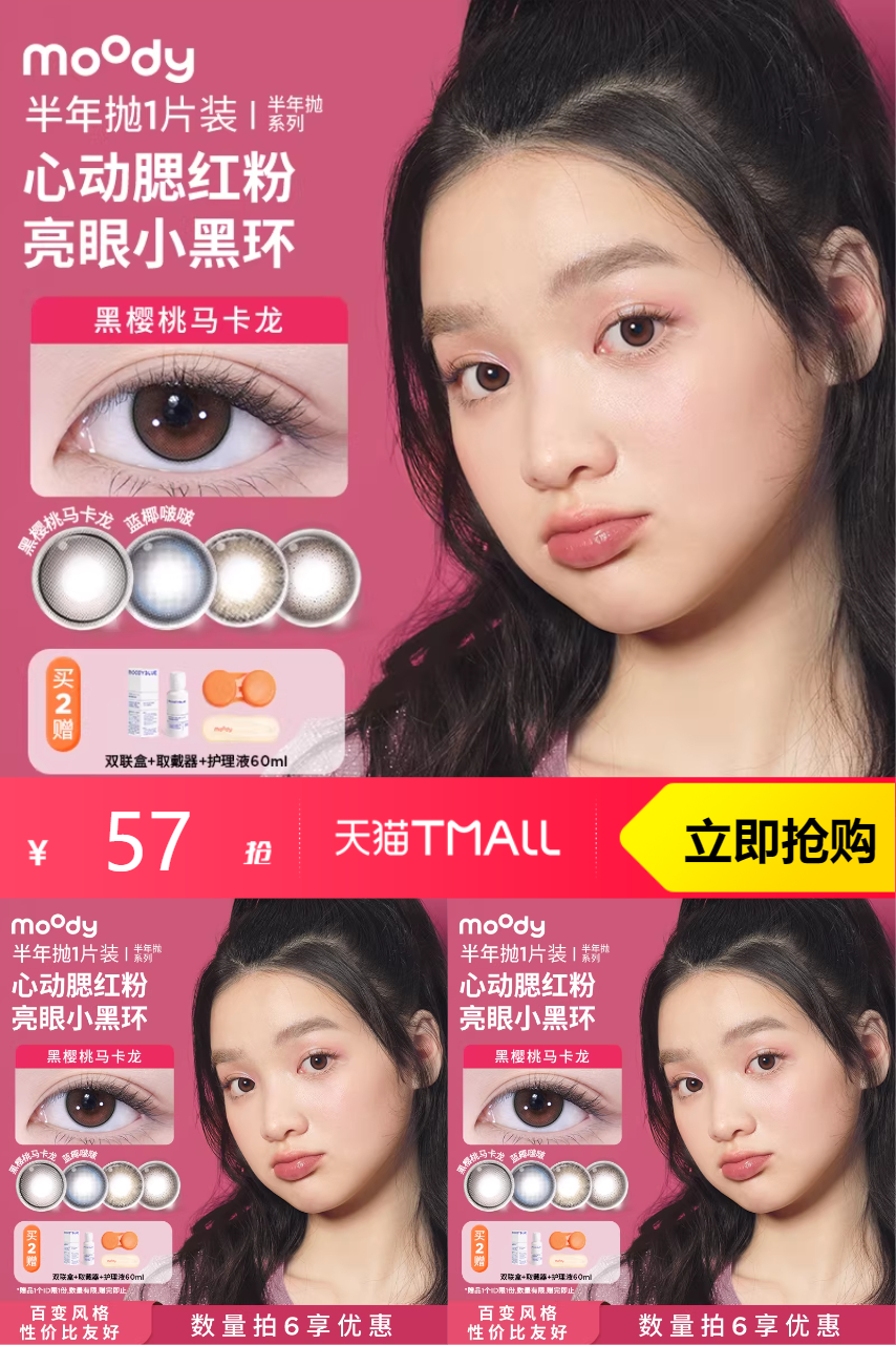 【淘金币减4.61元到手52.39元!约9.5/片,买2赠双联盒+取戴器+护理液60ml】moody美瞳长抛期隐形眼镜6片,百搭花色多样风格入门性价比之选~