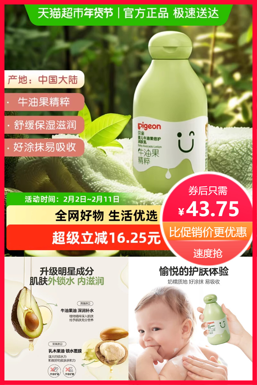 【超市补贴+淘金币+VIP到手约34.97】贝亲婴儿牛油果倍护润肤乳,牛油果精粹,舒缓保湿滋润,好涂抹易吸收,透润防干裂,一抹“森林奶油",呵护娇嫩肌。全新升级,成分更安心,温和舒缓宝宝小脸!