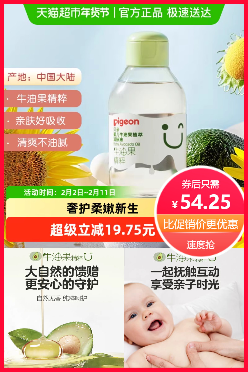【超市补贴+淘金币+VIP到手约44.14】Pigeon新生儿牛油果植萃润肤油,升级双重油粹,奢护柔嫩新生,无矿油矿脂,温和更安心,保湿不油腻,添加牛油果*乳木果油成分双重油粹,高保湿滋润,亲肤好吸收,清爽不油腻