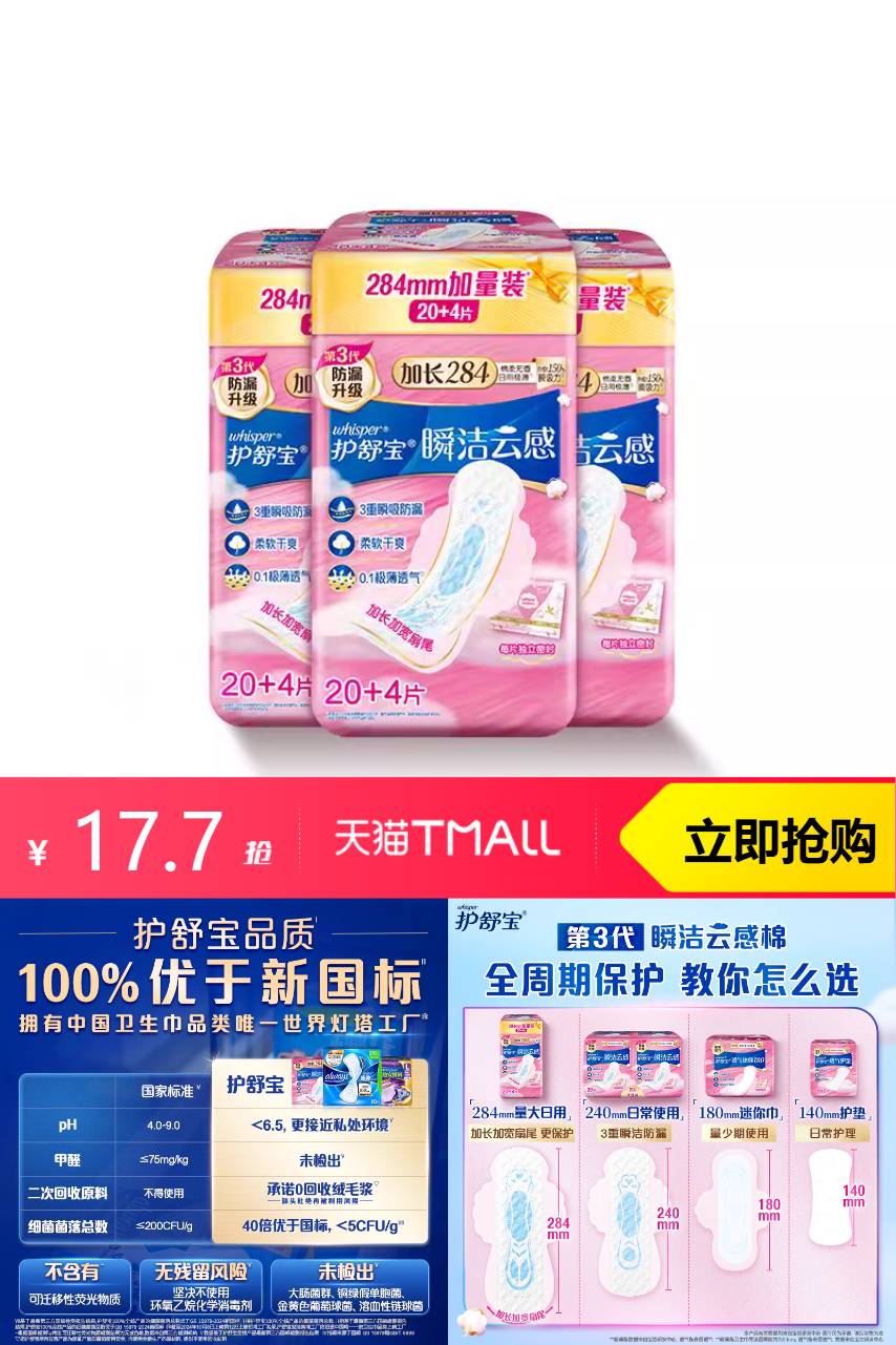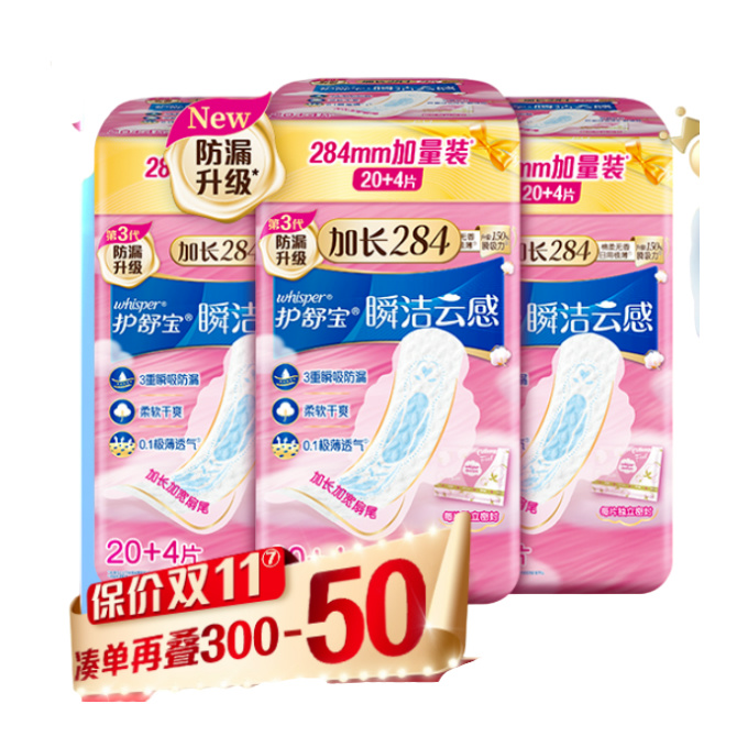 【淘金币减0.74,消费券红包减1.7元,24片到手15.26元,0.63元/片!】护舒宝瞬洁云感棉升级卫生巾日用超薄24片,3重瞬洁防漏,瞬吸·,瞬 锁,瞬 洁~