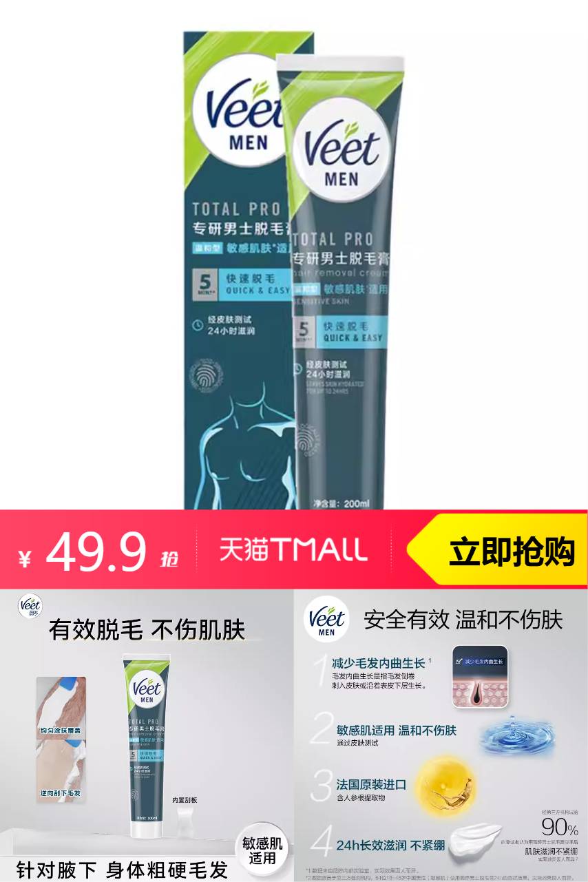 Veet薇婷男士脱毛膏腋下不留黑点学生,安全高效,温和不伤皮肤,浓密腿毛说再见,自由清爽出行~