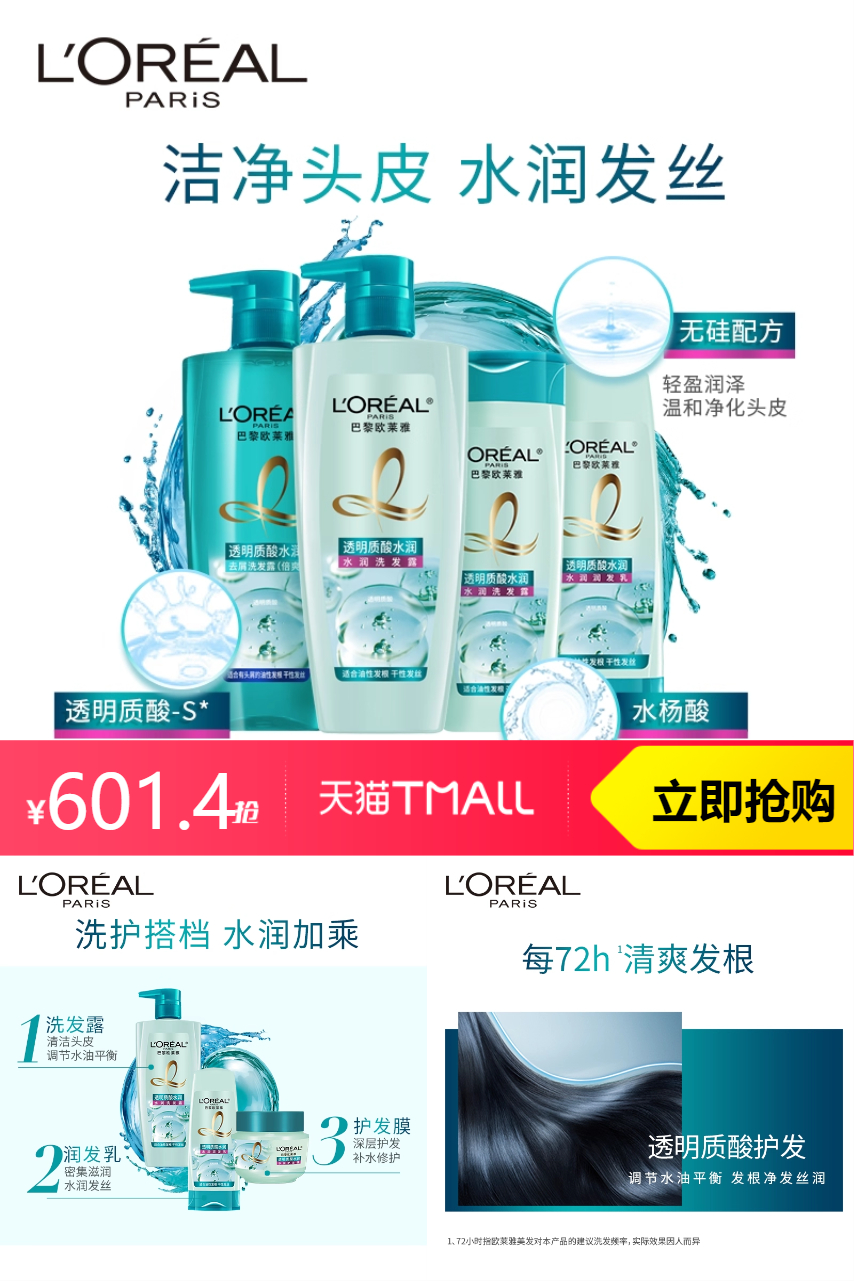 【买1减97.6元 ,买一件装送赠品小礼品赠品*2份,叠加8.46元淘金币+0.03元年货节超级红包,到手592.91元】欧莱雅质酸洗发水500ml*3*6件装,0%硅油,72H劲爽发根 水润发丝!