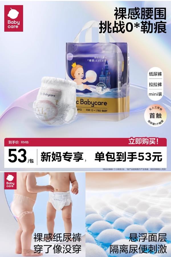 【新客到手36元/包,满2000-200元】babycare皇室pro裸感mini纸尿裤大促销!专为宝宝打造,轻薄透气,柔软舒适,呵护宝宝娇嫩肌肤。弹性腰围设计,宝宝动得更自在。限时优惠,错过再等一年!