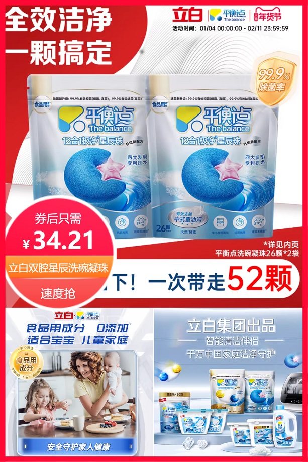 买就送送同款8颗*2袋,超级立减13元+券5元+点击右上角三个点进入淘金币抵扣10.69元后约34.21元,消费券+店铺限时红包后更实惠哦,平衡点双腔极净12合1星辰洗碗凝珠26颗*3袋,高效去油,光亮无异味,天然酵素,食品级成分,无添加!