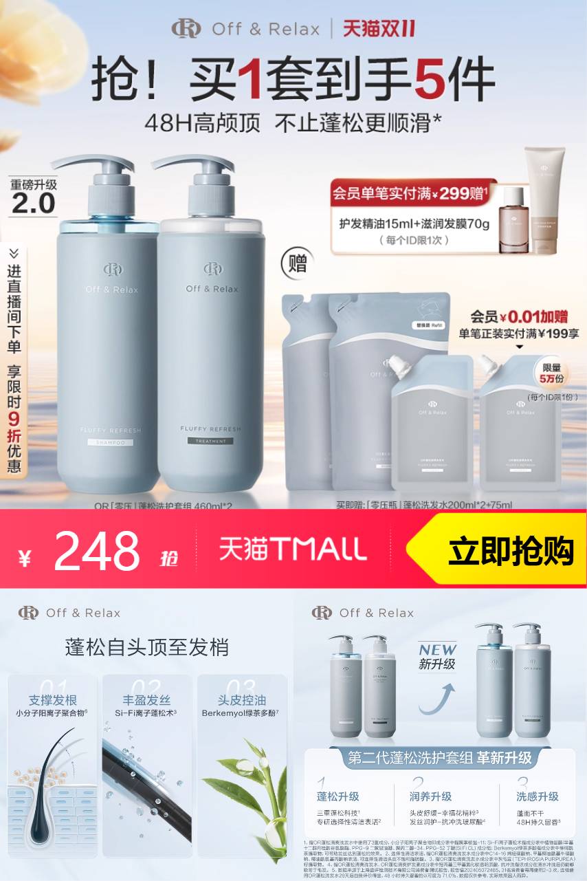 【有;叠27.04元淘金币+消费券到手198.86】OffRelax零压洗护套组控油洗发水,立体蓬松轻盈顺滑,含有天然植物精华,温和不刺激,对头皮超级友好!!