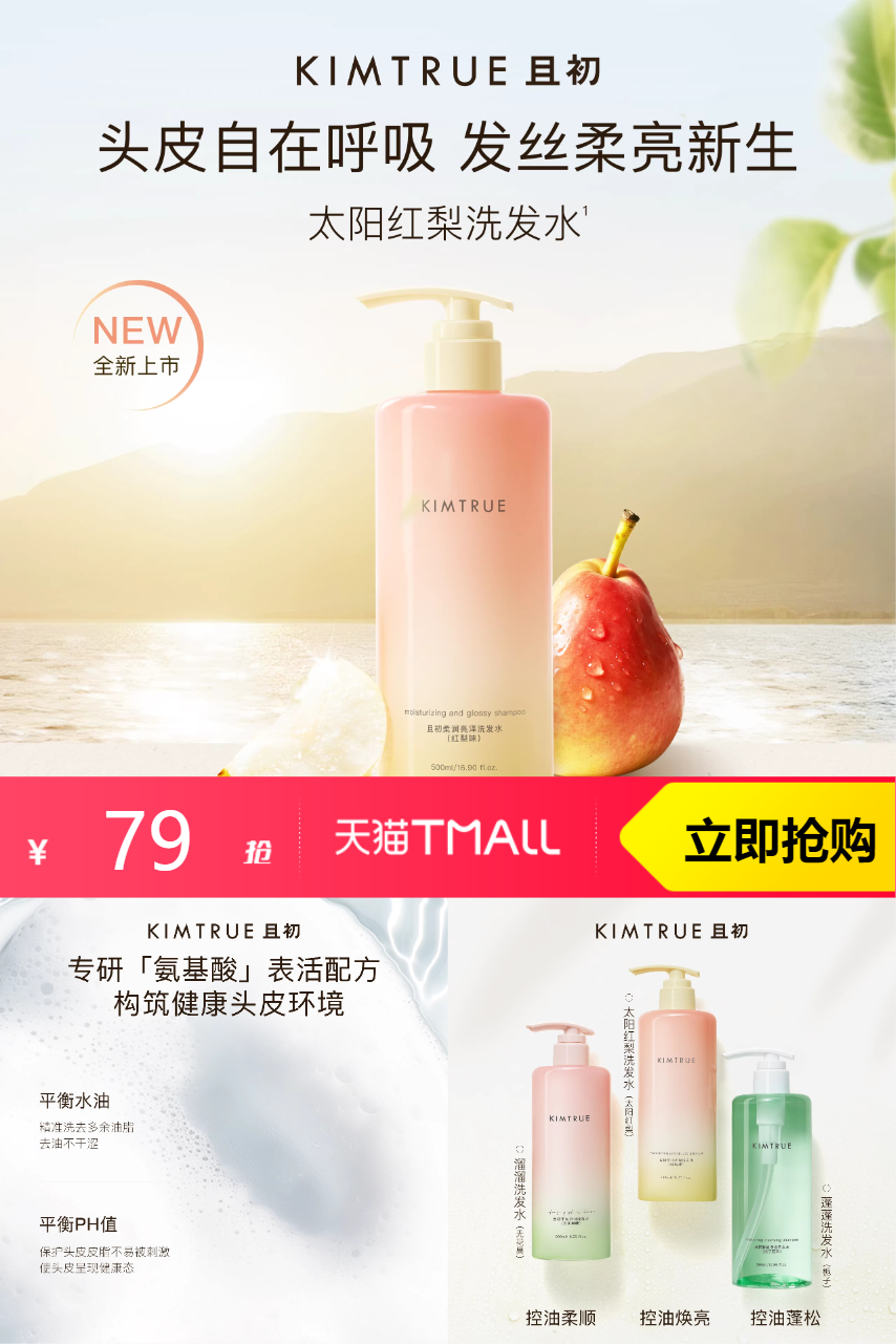 【原价105-官方立减13-满减券10-单品直降3-淘金币9.15-限时红包10元-首单礼金3元-满200-25消费券=到手48.32,买2赠洗发水80ml+10ml*4】KIMTRUE且初太阳红梨洗发水控油蓬松,头皮自在呼吸,发丝柔亮新生。