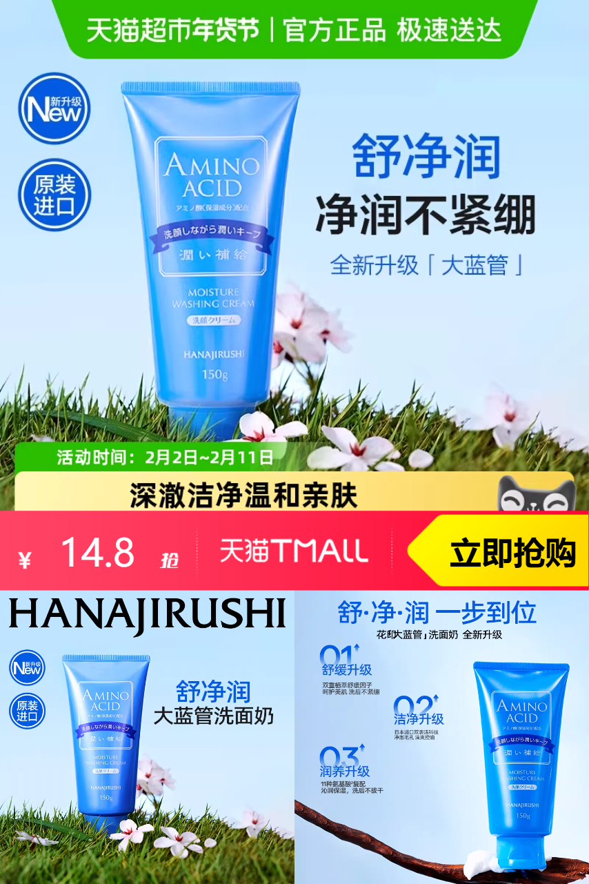 【88vip专享9.5折0.74,淘金币抵扣0.79,到手13.27】拍一发二花印含氨基酸洗面奶女男深层保湿补水清洁毛孔控油泡沫洁面乳进口。