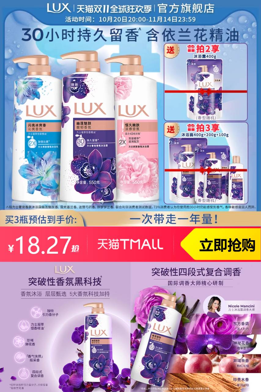【下拉详情页跳转淘金币,抵扣1.63元到手,拍2送400g,拍3送400g+200g+100g】力士精油香氛依兰香沐浴露550g,24小时持续留香,国际调香大师精心研制。