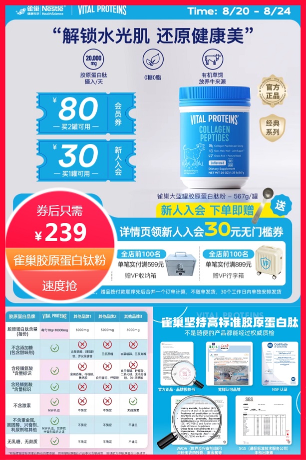超级立减36元+立减44元后约239元 ,全店前100名实付359元送猫卡30元,实付599送收纳箱,实付999赠vp行李箱,养发护甲守护关节健康,熬夜追剧加班、脱发严重、皮肤缺水的有救啦!纯净胶原蛋白,效果看得见