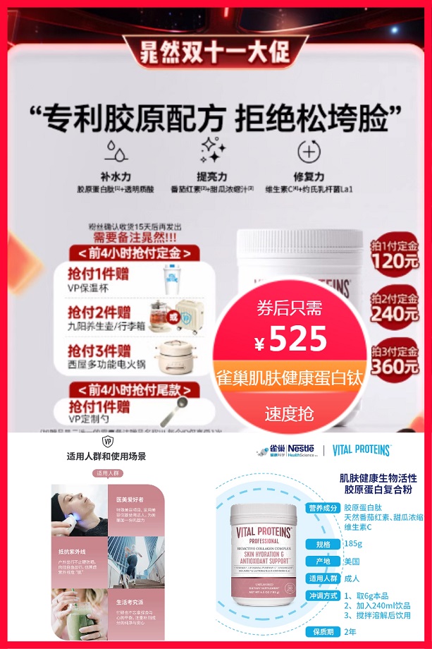 付定金120元,官方立减100元+消费券30元后约495元,抢付一件送vp保温杯,2件送九阳养生壶或行李箱,抢付三件送西屋多功能电火锅,活性胶原肽粉,小分子易吸收,直接渗透肌底,源头呵护你的肌肤。超赞~