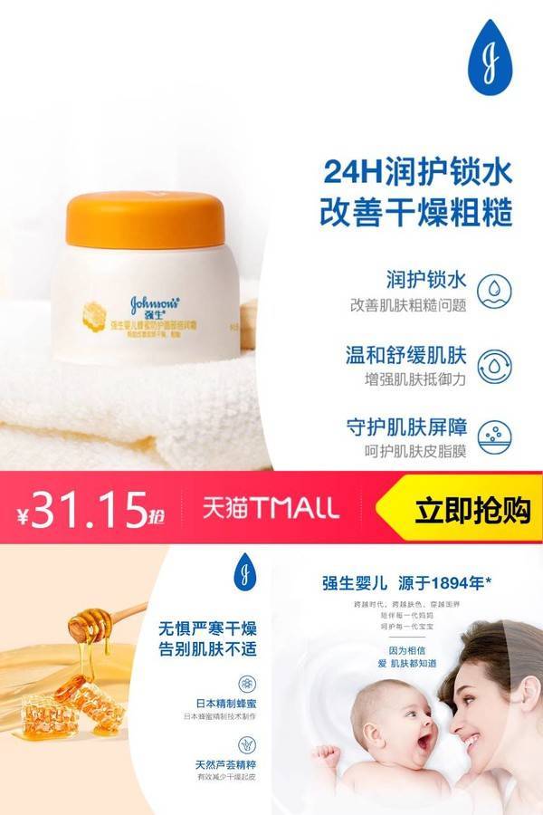 【官方立减6.2- 9淘客券-限时补贴1.42- 5.15立减优惠- 4.34淘金币,商品有回购礼金3元,到手22.39起】强生婴儿宝宝面霜秋冬蜂蜜防护倍润60g,独特的蜂蜜配方,深层次的滋润,有效防止干燥、脱皮。不管是小宝宝还是我们的大宝贝,秋冬季节都适合使用!