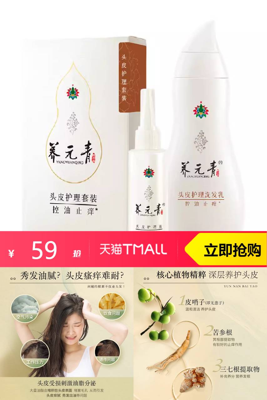 【叠品类劵+淘金币+淘礼金】云南白药养元青洗发水止痒套装控油洗发露210ml+65ml头发出油的姐妹们,无硅油洗发水适用长发,深层控油,防油脂阻塞毛孔,清爽止痒!天然药用植物育发液,拯救发际线