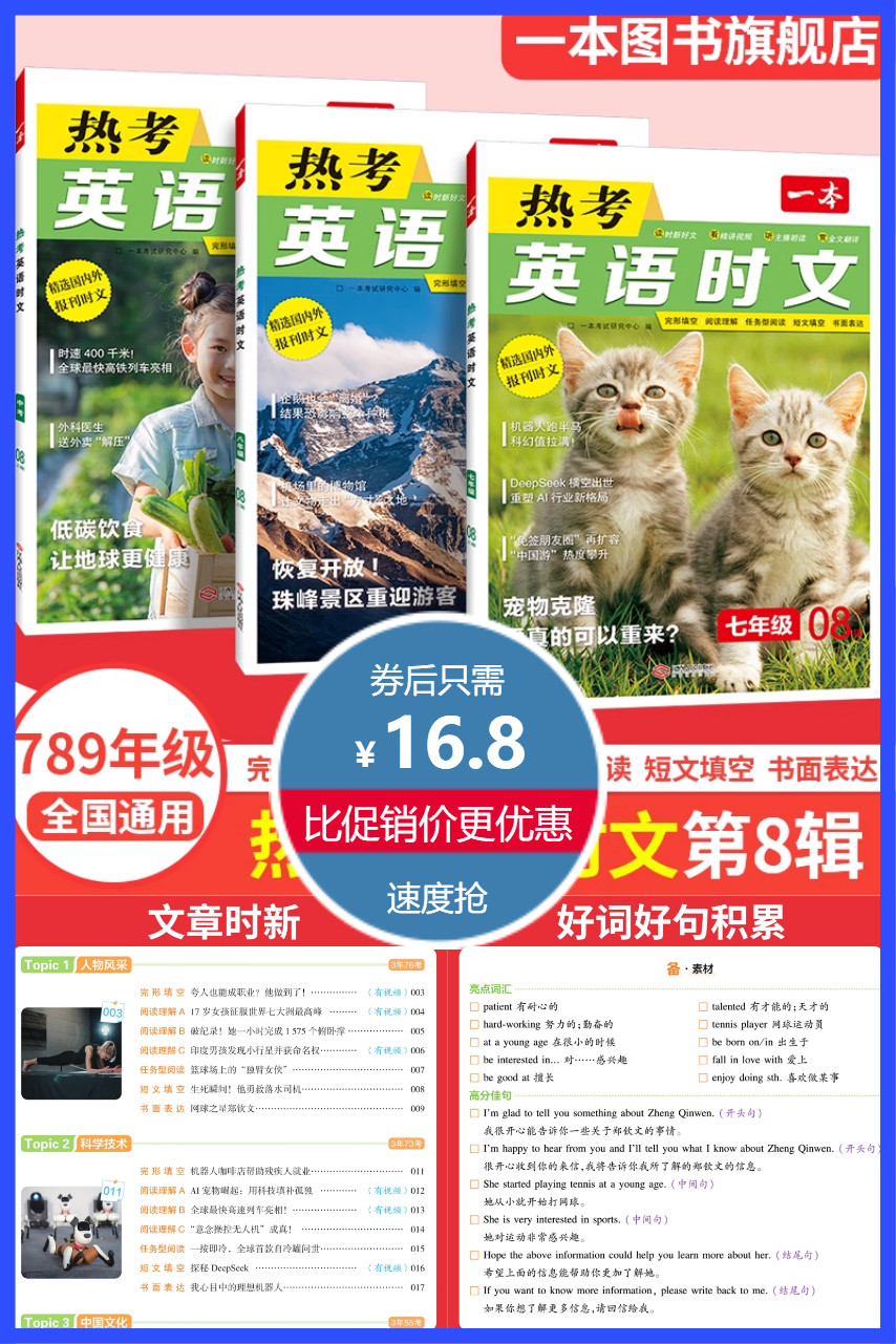 送时文话题词汇!一本初中通用热考英语时文阅读,789年级通用,完形填空,阅读理解,任务型阅读,短文填空,书面表达,好词好句积累,全文翻译精讲视频