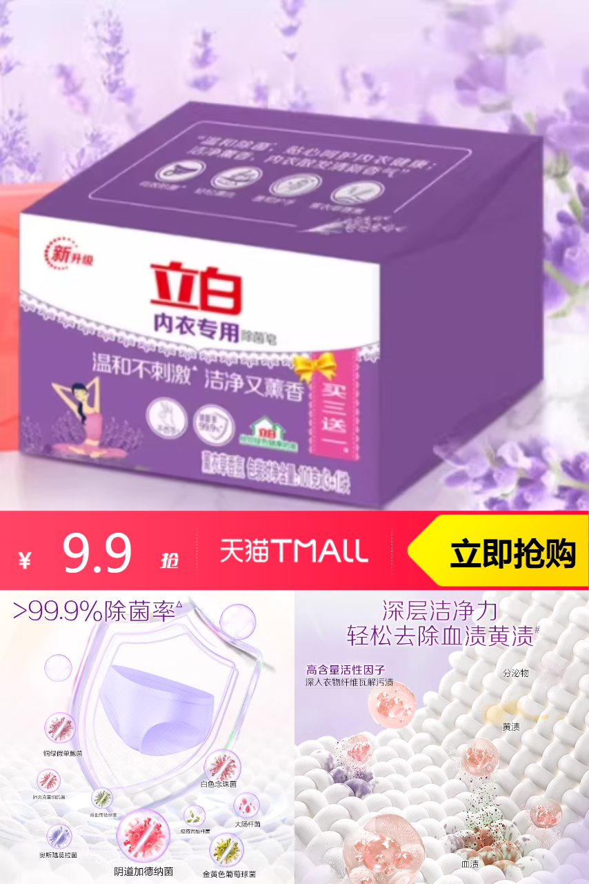 【叠加金币88vip后8.95】立白内衣裤专用除菌肥皂101g*4块,去污超强不伤肤,洁净除菌,温和亲肤~