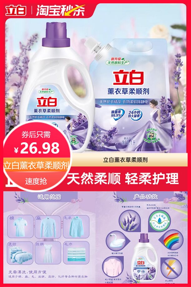 下拉详情淘金币抵扣3.42元后约26.98元10斤,套餐内含薰衣草柔顺剂2kg*1瓶+500g*4袋+送500g*2袋共10斤,立白薰衣草柔顺剂,防静电,淡雅清香,婴幼儿适用,安全不刺激,预防褶皱,防止变形!