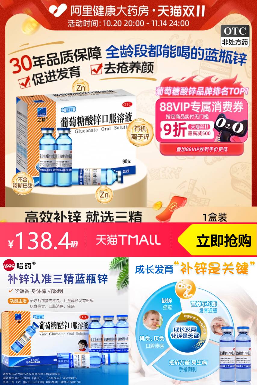 【原价268-折扣53.6-官方立减41-优惠券10-品类券25-9折券13.9-金币2.68=121.82到手】哈药三精蓝瓶葡萄糖酸锌口服溶液成人90支,人体所需的微量元素~