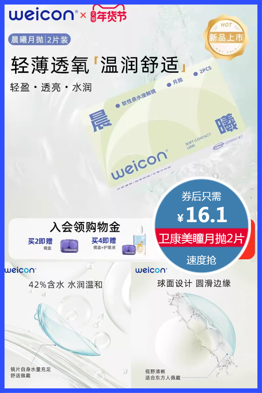 立减2.6元+88会员+淘金币+天降3元叠加劵到手约11.64元!卫康晨曦月抛美瞳隐形眼镜2片,非离子材质,敏感也舒适,轻盈、透亮、水润,42%含水水润温和,球面设计,圆滑边缘,视野清晰,水润透痒!
