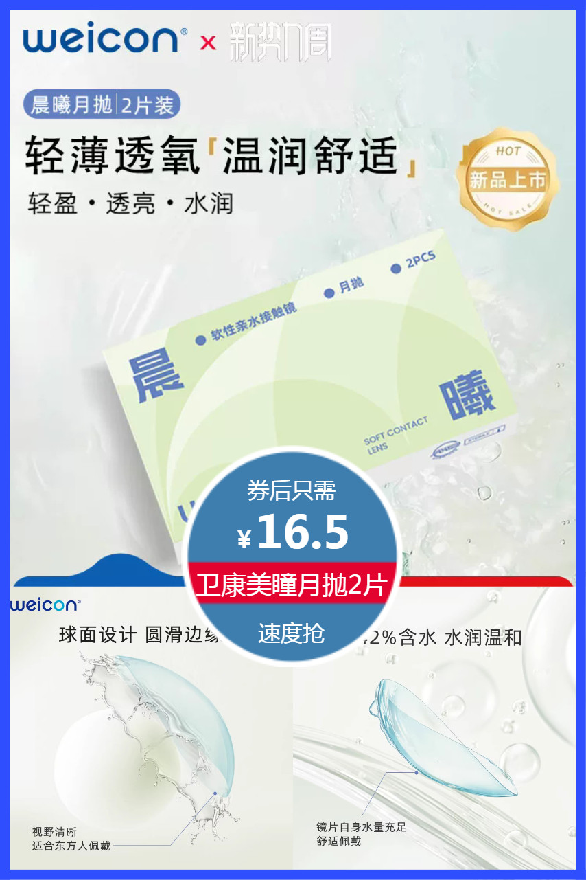 立减2.2元+88会员+淘金币+天降3元叠加劵到手12.02元!卫康晨曦月抛美瞳隐形眼镜2片,非离子材质,敏感也舒适,轻盈、透亮、水润,42%含水水润温和,球面设计,圆滑边缘,视野清晰,水润透痒!