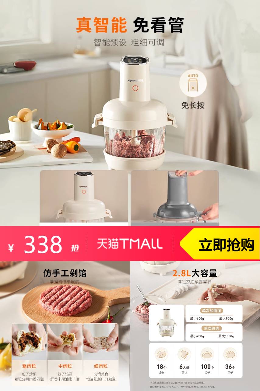 【10元券+88vip+淘金币+消费券+政府补贴到手210】九阳和面绞肉机新款家用多功能小型,采用全新升级的电机技术,无论和面还是绞肉,都只需轻轻一按,便可在短时间内轻松完成。